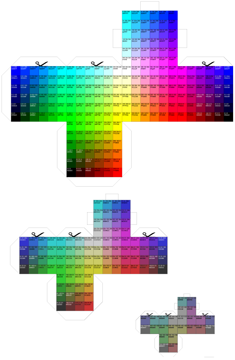 Conhece o colour cube? Representa as 216 cores implementadas pelos browsers nos sistemas com número de cores limitado. Criei um modelo em 3 dimensões que o leitor pode construir com cola e tesoura, imprimindo um ficheiro GIF(80Kb).