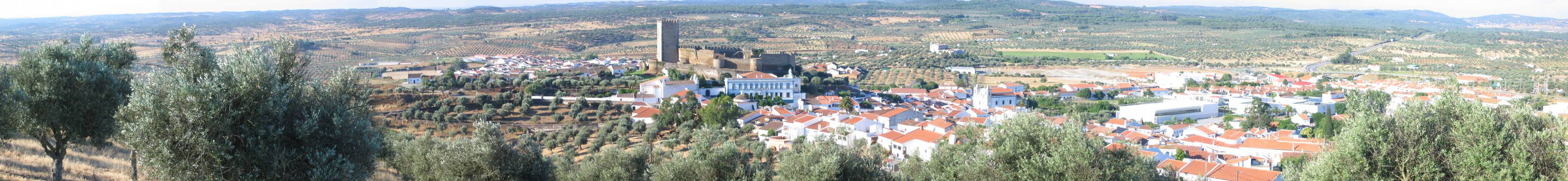 da vila de Portel e dos campos a Sul. No centro, destaca-se a colina do Castelo. A